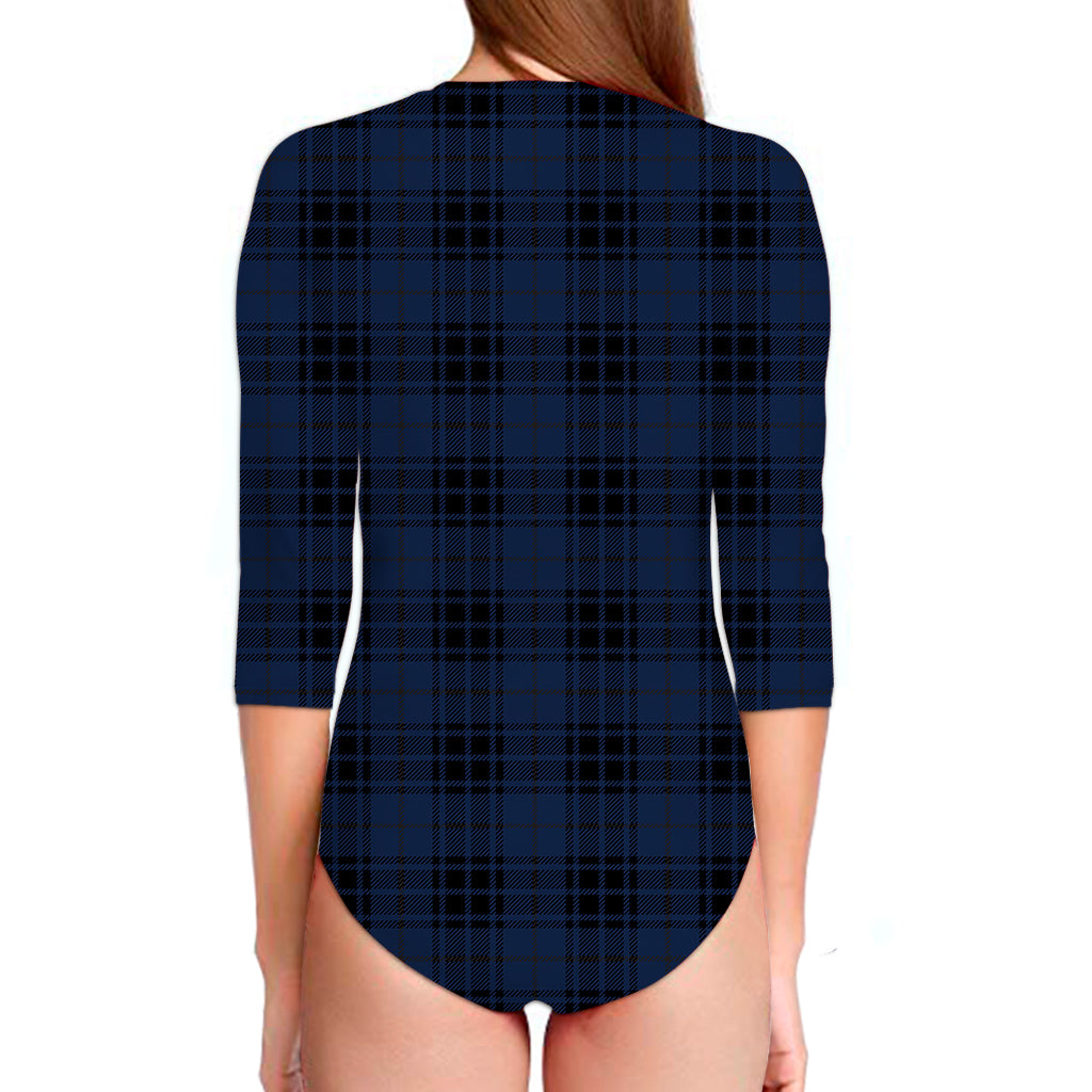 Blue And Black Tartan Pattern Print Long Sleeve One Piece Swimsuit
