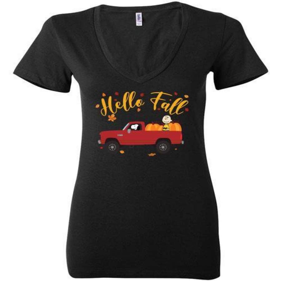Hello Fall Snoopy Driving Red Truck Ladies Deep V-Neck