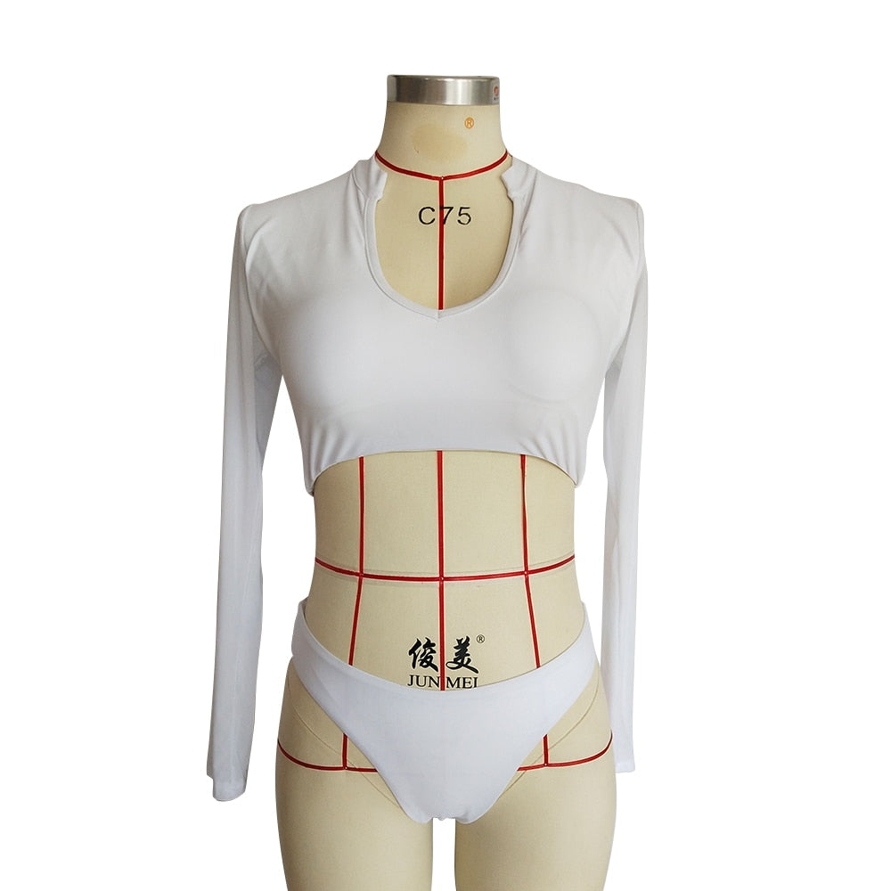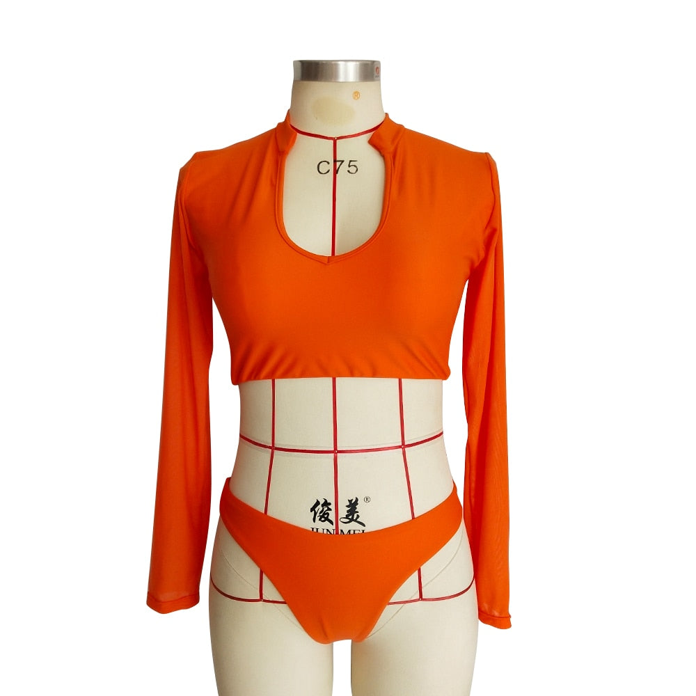 Long Sleeve Mesh Swimsuit One Piece Swim Wear Women Solid White Orange Thong Bathing Suit U Neck