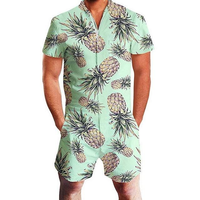 Men Fashion Print Jumpsuit Overalls Zipper One Piece Hawaiian shorts shirts